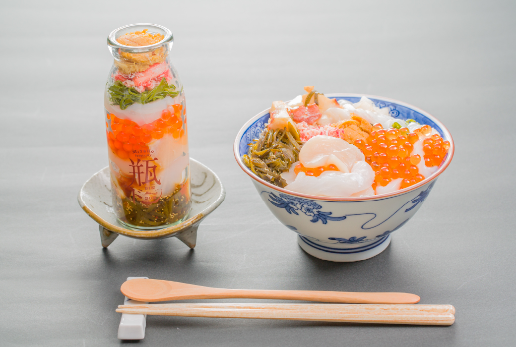 In Miyako City, fresh sea urchins stored in milk bottles are common. Taking this as a hint, colorful seafood, such as salmon roe, squid, sea squirts, and seaweed, were beautifully served up in a milk bottle. Yoshinori Akanuma, executive director of the Miyako Tourism and Cultural Exchange Association, which developed the product with its nine stores in the city, says, "We want people to enjoy the whole bounty of Miyako by pouring it over rice, whether a little at a time or all at once."
