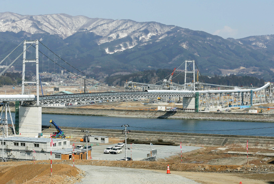 被災者の切実な願いは一日も早い住宅の再建。高台の移転先を大急ぎで造るため、山を削った土砂をベルトコンベヤーで運び出すことにした。気仙川を渡るつり橋は被災地見学の名所になり、「希望のかけ橋」と命名された。