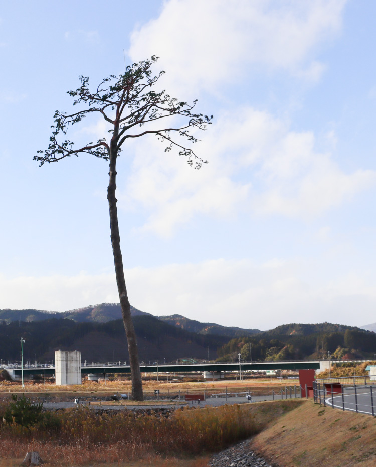 一面の泥の海に1本だけ、高さ27.5メートル、樹齢173年の松が残った。人々は、大地に踏ん張る大木の姿に自らの姿を重ね合わせ、「奇跡の一本松」の名がついた。